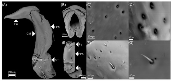 - Posterior phallobase and anterior phallobase (Figure 3E). The posterior phallobase is a sub-cylindric structure that involves the aedeagus and connects to the parameres. It is made up of one piece and presents a high diversity of ultrastructure (Figure 3F). The posterior phallobase has four types of ultrastructure: (1) large needle, (2) small needle, (3) pits (Figure 3F), and (4) small seta with a circular base (Figure 3G).