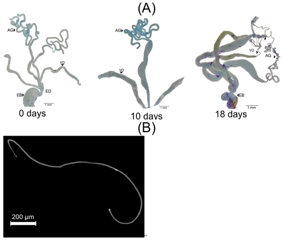 When males are 18 d old, the distal section of the accessory glands are filled with a white content, and the mature sperm is in the proximal portion of the vasa deferentia. Mature sperm has a filamentary shape (Figure 4B).