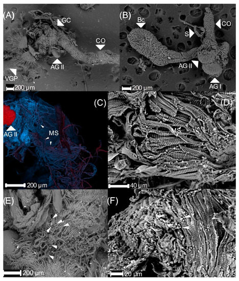 The male Melolonthidae reproductive apparatus typically comprises: (A) two accessory glands; (B) two vasa deferentia; (C) two testes, each with six follicles connected by the vasa efferentia; (D) an ejaculatory duct; (E) a genital capsule; and (F) an aedeagus [8,9]. The genital capsule with two plaques covers the endophallus. The most distal plaques of the genital chamber are called parameres, which are used by the male to secure the female and guide the aedeagus through the female’s urogenital pore [10]. In Melolonthidae, these parameres are species-specific and have taxonomic and evolutionary significance [11,12].