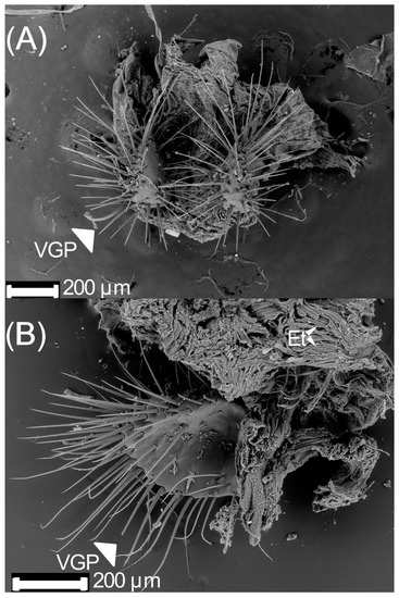 Figure 7. Ventral genital plates of 18 d old Cyclocephala barrerai virgin female: (A) ventral genital plates (front view), (B) ventral genital plates (lateral view). VGP = ventral genital plates.