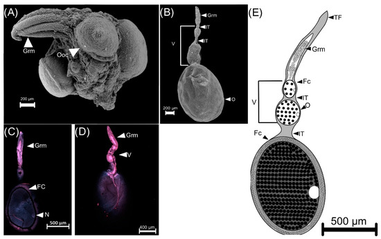 Telotrophic ovary of Cyclocephala barrerai. (A) ovary of 6 d old female, (B) ovariole of 12 d old female, (C,D) ovarioles (confocal scanning laser microscopy view). (E) scheme of ovary. Grm = gremarium, Ooc = oocyte, Fc = Follicular cells, V = vitellarium, TF = terminal filament, N = nucleus, IT = interfollicular tissue.