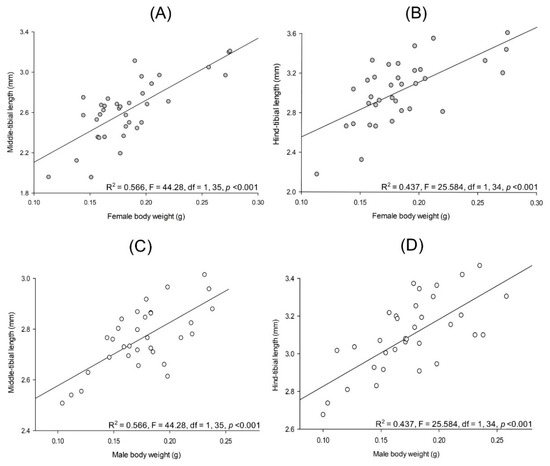 Relationships between body weight and tibial length on Cyclocephala barrerai. Female body weight and (A) middle-tibial length and (B) hind-tibial length; male body weight and (C) middle-tibial length and (D) hind-tibial length. Female = filled dots, male = open dots.