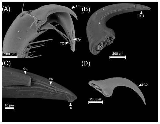 Tarsal claw of the first pair of legs of Cyclocephala barrerai males: (A) general view of the tarsal claw composition, (B) tarsal claw 1, (C) close-up of tarsal claw 1, (D) tarsal claw 2. TC1 = tarsal claw 1, TC2 = tarsal claw 2, Op = opening, Ch = channel, Ti = tip.