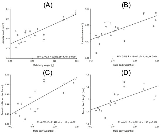 Relationships between body weight and different body parts on Cyclocephala barrerai males: body weight and (A) lamella length, (B) lamella area, (C) width of the base of tarsal claw 1, and (D) tarsal claw 1 length.