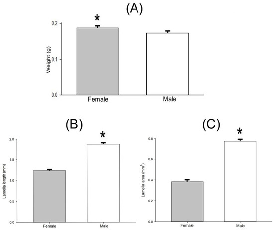 Mean ± SEM of weight (A), lamella length (B), and lamella area (C) of lab-reared males and females of Cyclocephala barrerai adults. t-test, * = significance 0.05.
