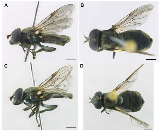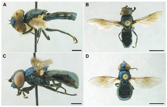 Figure 4. Orthonevra arcana sp. n., overall appearance. (A,B): Male holotype. (C,D): Female paratype. (A,C): Lateral view. (B,D): Dorsal view. Scale bars = 1 mm.