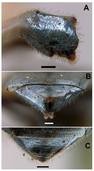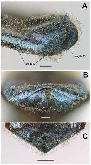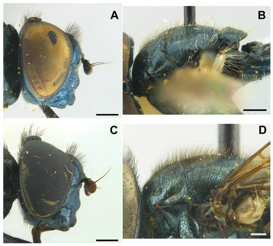 FEMALE (Figure 8B,D). Same as male except for the following: L = 5.96–7.84 mm; WL = 4.48–5.86 mm; basoflagellomere 0.9–1.03× longer than wide (n = 4). L = 6.35 mm; WL = 5.31 mm (n = 4); usually with more vivid blue reflections than males; basoflagellomere 0.99 × longer than wide (n = 4), brown; frons with scarce short, yellow hairs, as long as diameter of ocellus or nearly so; frons surface angled near antennae; posterior part of frons with a differentiated medial sulcus of conspicuous width, sulcus with lower hair density; anterior part of frons (posterior to the frons angle) with lateral wrinkles diagonal to eye margin; face flat, without tubercle; pollinose fascia of face of triangular shape; mesonotum only with short black setulae; abdomen roundish oval, slightly wider than scutum at the maximum scutum width (Figure 8D); tergum V entirely shiny; hairs of terga following the same pattern as in male; sterna with shorter hairs than in male, all semi-recumbent.
