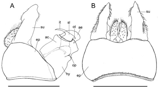 Male of Melanogaster baetica sp. n., genitalia (adapted from holotype). (A): Lateral view (left side). (B): Dorsal view. Legend: ac, aedeagus cover; ae, aedeagus; ep, epandrium; hy, hypandrium; it, inner tooth of the superior lobe of the aedeagus cover; op, outer projection of the hypandrium; ot, outer tooth of the superior lobe of the aedeagus cover; sl, superior lobe of the aedeagus cover; su, surstylus. Scale bars = 0.5 mm.