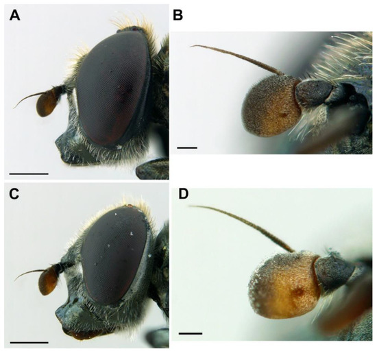 Figure 5. Orthonevra arcana sp. n. (A,B): Male holotype. (C,D): Female paratype. (A,C): Head, lateral view. (B,D): Right antenna, lateral view. Scale bars = (A,C): 0.5 mm; (B,D): 0.1 mm.