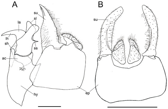 Figure 7. Orthonevra arcana sp. n., male genitalia (adapted from holotype). (A): Lateral view (right side). (B): Dorsal view. Legend: ac, aedeagus cover; ep, epandrium; hy, hypandrium; la, apico-dorsal lobe of aedeagus; lh, large hook-like process of the apico-dorsal lobe of aedeagus; sh, small hook-like process of the apico-dorsal lobe of aedeagus; sl, superior lobe of the aedeagus cover; ss, spur of the superior lobe of the aedeagus cover; su, surstylus. Scale bars = (A): 0.25 mm; (B): 0.5 mm.