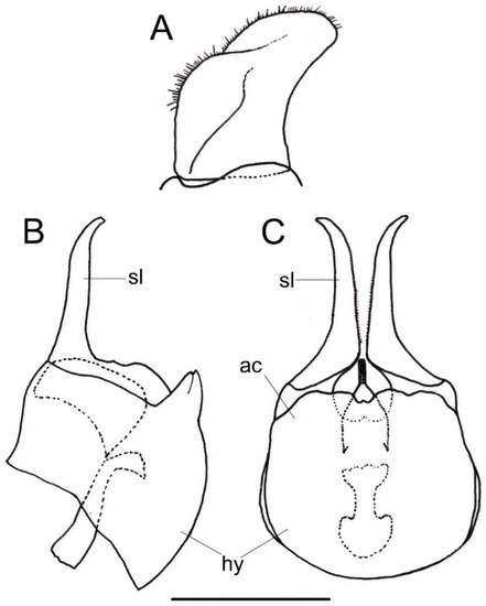 Chrysogaster coerulea, male, genitalia. (A): Left surstylus, lateral view. (B): Hypandrium, lateral view. (C): Hypandrium, ventral view. Legend: ac, aedeagus cover; hy, hypandrium; sl, superior lobe of the aedeagus cover. Scale bars = 1 mm.