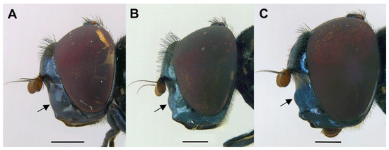 Males of Chrysogaster, head, lateral view. (A): Chrysogaster basalis. (B): Chrysogaster solstitialis. (C): Chrysogaster coerulea. An arrow indicates the position of the facial tubercle. Scale bars = (A): 0.75 mm; (B,C): 0.5 mm.