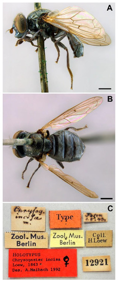 Examined material. Hermann Loew described this species from a female collected in ‘Posen’ on 1st May (1843). Maibach et al. [7] indicated that there is a female in Loew’s collection (ZMB, Berlin) that is, unquestionably, the type of C. incisa. This specimen was located in the ZMB by the authors of the present paper and confirmed to be the type of this taxon. The specimen, in good condition, is labelled as follows: 1♀, ‘Posen 1.5.43’ (handwritten), ‘Coll. H. Loew’ (printed), ‘12921’ (printed), ‘Type’, ‘Chrysogas. incisa m.’, ‘Zool. Mus. Berlin’ (printed on yellow label), ‘Zool. Mus. Berlin’ (printed on white label), ‘HOLOTYPUS Chrysogaster incisa Loew, 1843 Des. A. Maibach 1992’ (Figure 11C).