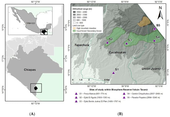 Figure 1. Map of the distribution of sampling sites in the Tacaná Volcano Reserve, Chiapas, Mexico. (A) Geographical Location, (B) Sites of study.