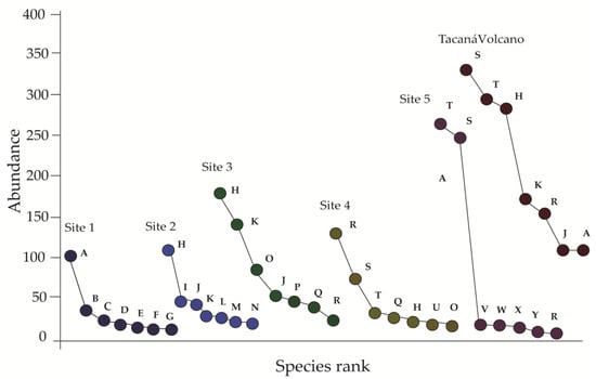 Figure 3. Rank-abundance curves of Neuroptera species for the different sampling sites and at the regional level of the Tacaná Volcano, Mexico. Species: A. Semidalis soleri, B. Leucochrysa pretiosa, C. Leucochrysa askanes, D. Megalomus minor, E. Leucochrysa lateralis, F. Myrmeleon timidus, G. Leucochrysa tarini, H. Semidalis problematica, I. Chrysopodes crassinervis, J. Ceraeochrysa sarta, K. Hemerobius hernandezi, L. Semidalis hidalgoana, M. Leucochrysa maculosa, N. Ceraeochrysa arioles, O. Meleoma titschacki, P. Chrysopodes varicosus, Q. Ceraeochrysa tacanensis, R. Coniopteryx simplicior, S. Hemerobius jucundus, T. Hemerobius discretus, U. Semidalis manausensis, V. Coniopteryx latipalpis, W. Conwentzia barretti, X. Hemerobius alpestris, Y. Sympherobius axillaris.