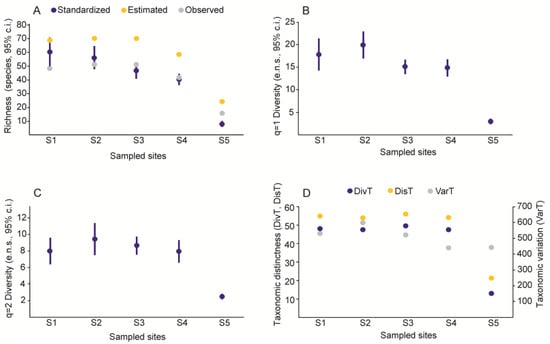 Figure 4. Species richness and diversity of orders 1 and 2 and taxonomic distinctness indices for each of the sampled sites. (A) Species richness, (B) Order q = 1 diversity, (C) Order q = 2 diversity, (D) Taxonomic distinctness (DivT), average taxonomic distinctness (DistT), and taxonomic variation (VarT). For standardized diversity values, error bars are 95% confidence intervals (c.i.), and for q = 1 and q = 2 diversities, the units are the effective number of species (e.n.s.).