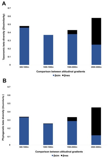 Phylogenetic beta diversity, which took into account the supra-specific taxonomic levels between the five sites of the altitudinal gradient (βSOR = 60.4%), was explained by a high turnover (βSIM = 49.8%) and a low nestedness (βNES = 10.6%). When evaluating the taxonomic dissimilarity between pairs of sites, a very similar trend was found for the beta diversity of species, although with lower values for including supra-specific taxa (Figure 5B).