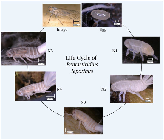 The life cycle of Pentastiridius leporinus. Development from the egg to the adult imago proceeds through five instar nymphs (N1–N5).
