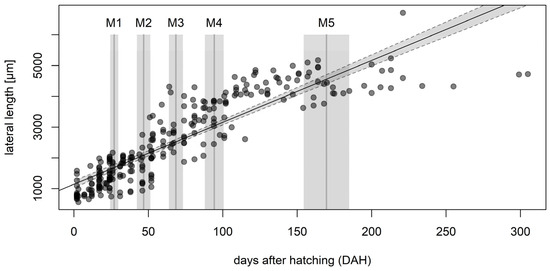 Growth rate of Pentastiridius leporinus. The body length (shown as lateral length in μm on the y-axis) was determined for n = 60 nymphs over a period of 34 weeks. Light gray intervals around molting time points (dark gray bars) represent ± one standard error of the mean. A linear regression yielded the function y = 20.6x + 1176.4, which is displayed as a solid black line with gray dashed lines indicating the 95% confidence interval.