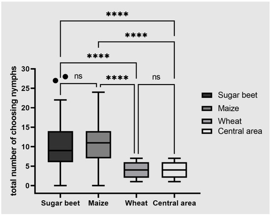 Host choice experiment in which Pentastiridius leporinus nymphs were placed in the central area and given a free choice of three alternative hosts. The number of nymphs found in the four areas of the test was counted after 1, 3, 6, 12, 24 and 48 h. The box plot shows the distribution of nymphs in all four areas averaged over all time points. Data were analyzed using a Friedman test. Boxes span the 25th to 75th percentiles, and the horizontal line in the box represents the median. The whiskers and outliers are plotted using Tukey’s method. Outliers are plotted as individual points. Each experiment was carried out with five sets of 30 nymphs. Statistical significance: **** p ≤ 0.0001; ns, not significant.