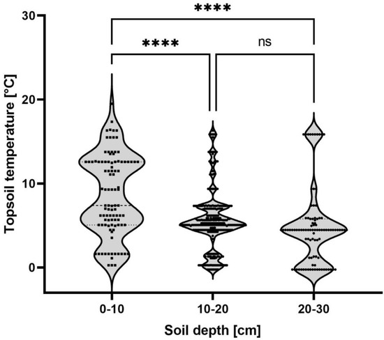 Subterranean Pentastiridius leporinus nymph movement. The topsoil temperature at which individual nymphs between November 2020 and March 2022 were found is plotted against the soil depth. In June, the site was changed due to the emergence of P. leporinus adults. Sample sizes per group: 0–10 cm (n = 95), 10–20 cm (n = 298), 20–30 cm (n = 95). Each data point represents one nymph. Data were analyzed by one-way ANOVA. Violin plots indicate the frequency distribution of the nymph movement; lines indicate median and quartiles. Statistical significance: **** p ≤ 0.0001; ns, not significant.