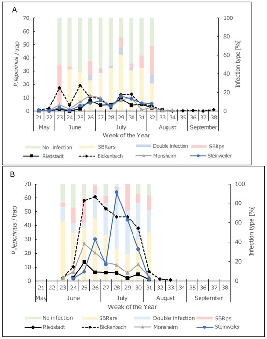 Adult abundance (lines) and infection rates (columns) of adult P. leporinus at four different locations in Rhineland-Palatinate and Hesse. The numbers representing adult abundance are means of three sticky traps for (A) 2020 and (B) 2021. The number of adult samples per week for the analysis of SBRars + SBRps infection rates was (A) 10–40 for 2020 and (B) 7–40 for 2021.