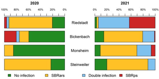 In both years, and at all sites except Riedstadt in 2021, SBRars was the dominant pathogen. Interestingly, 94.3% of the planthoppers examined in Riedstadt, tested positive for infection with SBRps.