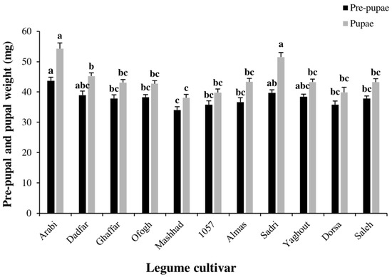 Pre-pupal and pupal weights of Spodoptera littoralis reared on various legume cultivars. Each column represents the mean of 25 independent estimations ± standard error (SE). Different letters indicate statistically significant differences (Tukey, p < 0.01).