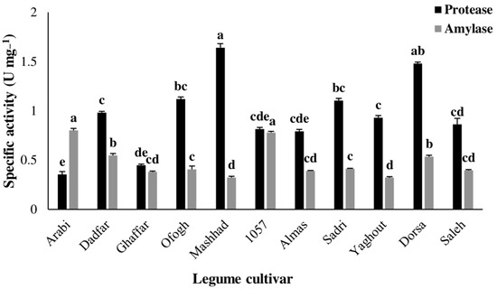 General proteolytic and amylolytic activity of midgut extracts from Spodoptera littoralis larvae reared on various legume cultivars. Each column represents the mean of four independent estimations ± standard error (SE). Different letters indicate statistically significant differences (Tukey, p < 0.01).