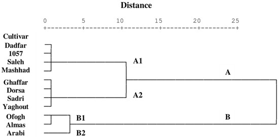 The dendrogram based on body weight, demographic characteristics as well as proteolytic and amylolytic activities of S. littoralis revealed two groups designated A and B (Figure 4). Cluster A consisted of two sub-clusters: A1 (Dadfar, 1057, Saleh, and Mashhad cultivars), which shared characteristics distinguishing them as the most resistant hosts, and A2 (Ghaffar, Dorsa, Sadri, and Yaghout cultivars), which were designated as relatively unsuitable hosts for S. littoralis. However, sub-cluster B1 contained Ofogh and Almas cultivars, which were considered relatively suitable hosts for S. littoralis. The results also delineated a sub-cluster B2, which consisted of common bean, Arabi, and which was the most susceptible cultivar for S. littoralis.