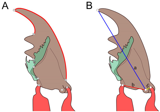 (A) Scheme of a measured mandible with registered landmarks (numbers). Ventral aspect of left mandible. Red lines with semilandmarks, 3′ as alternative landmark 3, 4′ as alternative landmark 4 in cases where a brush-like prostheca was not present (cf. Rugilus spp.), (B) Scheme of registered landmarks with levers, ventral view of left mandible, a = mandible length, blue; b = in-lever, red; c = out-lever, yellow.