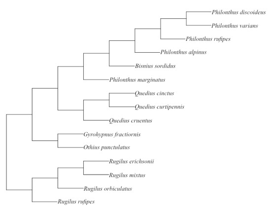 For species with multiple individuals, species data are represented as mean values with the standard deviation (Appendix A, Table A1). The data are body-size corrected, as only ratios were used for analysis. As data for species cannot be treated as independent [33,34], we analysed our results by using phylogenetic comparative methods. With this aim, we compiled a phylogenetic scheme of the investigated species from various literature sources (Figure 2). We followed [35] and [36] as well as [37] to establish the relationships within and between the genera Quedius, Othius, Gyrohypnus, and Bisnius and the external relationships between the aforementioned genera and Philonthus and Rugilus. The phylogenetic relationships of the species within Philonthus and Rugilus were approximated using taxonomic information [38]. For the analysis, branch lengths values were set to one, because they could not be calculated for our phylogenetic scheme [39]. Phylogenetic independent contrasts (PICs) were calculated using the “ape” package (version 5.0, [40]) in RStudio (Version 1.2.5001, [41]). Since the data, even after logarithmic and arcsine transformation, did not fulfil the required normal distribution for parametric PGLS methods, Spearman rank-sum correlations were calculated by means of the “Hmisc” package (version 4.4-1, [42]) in R. A stepwise discriminant function analysis (DA) was performed on the log10-transformed morphometric ratios (Appendix A, Table A1) and on the scores of the geometric morphometric PCA (PC1, PC2) in order to analyse the predictive properties for tribe membership of the morphometrical measurements by using SPSS 27 (version 27.0.0.0, [43]).
