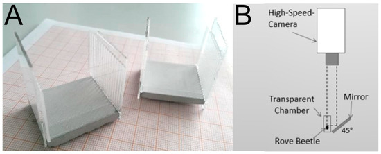 The events of beetles capturing prey were filmed with a highspeed camera (Photron FastCam SA3120K-K2; measurements on 500 fps, Pfullingen, Germany) equipped with a macro lens. During the filming, the beetles were kept in small width-adjustable chambers (2.5 cm height and 3.5 cm length) that were fabricated of gypsum and microscopy glassware (Figure 3A). Inside the chambers, the beetles were filmed with the camera attached above. A mirror was placed at an angle of 45° nearby to provide recordings of the scene from various perspectives (Figure 3B) (cf. [45]). Infrared light at 850 nm (medium range), which is outside of the visible light spectrum for most insects [46], provided by a security lamp (Bosch IR Illuminator 5000 MR; Grasbrunn, Germany) was used for illumination during the filming in order not to distract the animals with unnatural light conditions.
