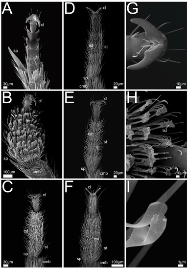 SEM views of Xantholinini, Othiini and Stilicina front legs. Images A–F with ventral view of claw, tarsomeres and end of tibia (left front leg). G–I, detailed views of adhesive setae and claw, (A) Gyrohypnus fracticornis (male); (B) Othius punctulatus (male); (C) Rugilus erichsonii (male); (D) R. mixtus (male); (E) R. orbiculatus (male); (F) R. rufipes (male); (G) G. fracticornis (male), ventral view of claw (left front leg); (H) O. punctulatus (male), ventral view of fourth and fifth tarsomere; (I): R. orbiculatus (male), ventral view of adhesive spatulate seta heads. Abbreviations: cl: claw; cmb: comb-like structure; sp: spur; st: setae (non-adhesive); tst: tenent setae.