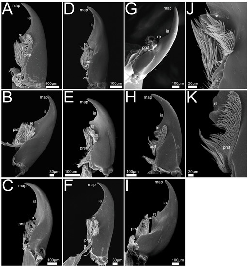 SEM views of Staphylinini mandible. Images A–I ventral aspect of mandible, J–K with detailed views of prostheca. (A) Bisnius sordidus; (B) Philonthus varians; (C) P. marginatus; (D) P. rufipes; (E) P. discoideus, (F) P. alpinus; (G) Quedius cinctus; (H) Q. cruentus; (I) Q. curtipennis; (J) P. discoideus, ventral aspect of prostheca; (K) Q. cruentus, ventral aspect of prostheca. Abbreviations: ia: incisor area; map: mandibular apex; prst: prostheca; re: retinaculum.