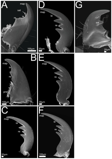 SEM views of Xantholinini, Othiini and Stilicina mandible. Images A–F ventral, (G) dorsal aspects of mandible. (A) Gyrohypnus fracticornis; (B) Othius punctulatus; (C) Rugilus erichsonii; (D) R. mixtus; (E) R. orbiculatus; (F) R. rufipes; (G) G. fracticornis. Abbreviations: ia: incisor area; map: mandibular apex; prst: prostheca; re: retinaculum; sat: subapical tooth.