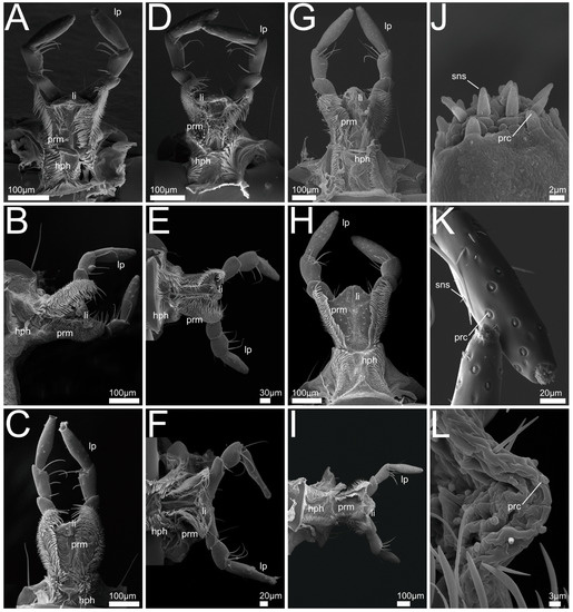 SEM views of Staphylinini labium-hypopharynx. Images A–I dorsal aspect of labium-hypopharynx, J–L with detailed views of receptors on apical palpomeres and ligula, (A) Bisnius sordidus; (B) Philonthus varians; (C) P. marginatus; (D) P. rufipes; (E) P. discoideus; (F) P. alpinus; (G) Quedius cinctus; (H) Q. cruentus; (I) Q. curtipennis; (J) B. sordidus, apical receptor bundle; (K) P. rufipes, apical segments of labial palpi; (L) P. discoideus, dorsal aspect of anterior prementum and ligula. Abbreviations: hph: hypopharynx; li: ligula; lp: labial palp; prc: papilliform receptor; prm: prementum; sns: sensilla.