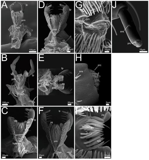 Mandible (Figure 8B–F,J): Slender, crescent-shaped (P. marginatus, Figure 8C), robust (P. discoideus, Figure 8E), or with wide base up to retinaculum and tapered towards apex. Mandibular apex acute and oriented mediad, cutting edge (incisor area) connecting apex with retinaculum, subapical tooth absent.