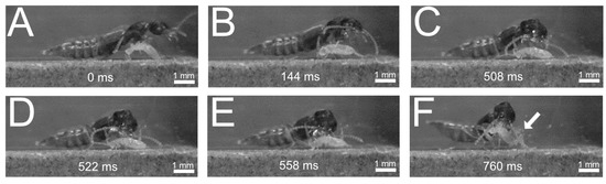 In both subfamilies, generalist predation has been described except for some specialist predatory species of Staphylininae and inquiline species of Paederinae associated with feeding on the brood of their social insect hosts [5]. Generalist predatory beetles within the Staphylinidae have been observed to prey upon Nematoda, Oligochaeta, Acarina, Araneae, Collembola, Coleoptera adults, Diptera larvae, and adults and Lepidoptera larvae [5]. Similar prey can be expected to be found on the menu of beetles of the Staphylininae and Paederinae, depending on the habitats of the beetles. In rearing studies, both the larvae and adults of several species of both groups have been observed to readily accept Nematoda, Collembola, and various Diptera [21], making them attractive as research organisms that can be kept over longer periods of time for laboratory experiments. Since different prey species have different strategies of evading, escaping, and fending off a predator, a high repertoire of specializations can be expected within generalist predatory insects hunting them [22,23]. One mechanism of passive defence found among many of the above-listed prey organisms against generalist rove beetles is the development of a mechanical barrier to the mandibles of the predator, e.g., the cuticle of the head, the thorax, and the abdomen of the prey is thickened [23]. This can often be found, for example, in Acarina and adult Coleoptera. An active defence mechanism is represented by a locomotive response of the prey, i.e., it actively flees from the predator [23]. Members of the Collembola and Diptera that are possible prey of generalist staphylinids rely mostly on this type of defence. These are only two examples for the many various defence strategies of possible prey organisms [23]. Despite some specialists among the prey having evolved various and, in some cases, highly complex morphological defence structures, generalist species within the Staphylinidae are nevertheless successful when hunting such prey. A few specialists show multiple adaptations towards prey capture. For example, Stenus beetles have evolved a highly specific, rapidly, protrusible labium with terminal adhesive cushions to catch fast fleeing springtails [9,10,11] (reviewed in [24]). These beetles are also equipped with mandibles that are sharp and strong enough to crack the hard shells of oribatid mites [25]. These structures are similar in complexity among the various species but are often of highly differing morphology. Philonthus marginatus Müller, 1764 beetles, for example, use their raptorial forelimbs to catch elusive springtails. The forelimbs of the beetles are covered with thorny bristles on the inner side and have an elongated coxa and femur as well as retractable claws and adhesive tarsi [18].