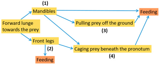 In each prey-capture trial, the beetles were left together with at least one individual of one of the three prey in the transparent chambers for at least 10 min. This was repeated three times for each prey type per beetle to enhance the chance of observing the beetle attacking the prey. We therefore achieved a total of nine trials per beetle evenly distributed across the three prey types. Individuals that showed only low activity during the main experiments or were not recorded in sufficient quality were provided another 1–3 opportunities to perform towards the potential prey. Between the repeats and before the first day of observation, all individuals were kept isolated under starvation conditions for three days before the recordings to increase their feeding motivation. Following the observational experiments, the beetles were killed by being placed in a refrigerator and were transferred to 70% ethanol for later species identification [38]. Definitions and descriptions of the observed behaviours were derived by subsequent careful observation of the videos.