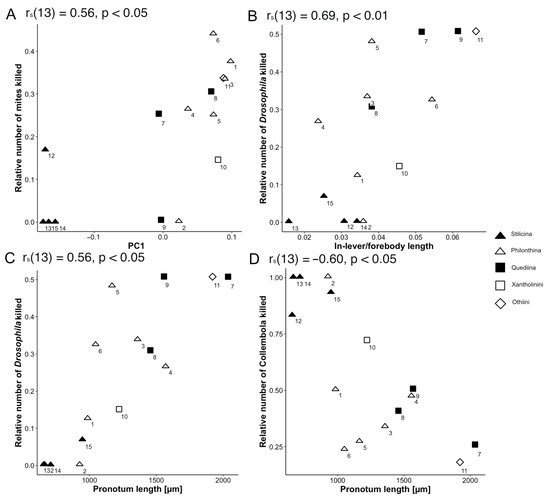Overall, this exploratory study provides valuable insights into relationships between morphology and prey capture in modern Staphylinidae and that must have played a major role in their evolutionary success.