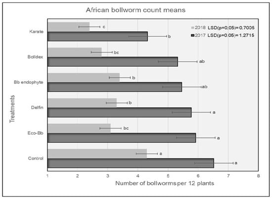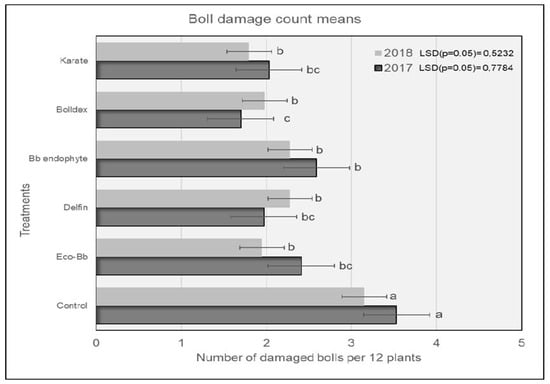 The average number of damaged bolls found on different treatments during the 2017 and 2018 seasons. Means with the same letter are not significantly different (p < 0.05). The comparison was carried out using the data from the same year.