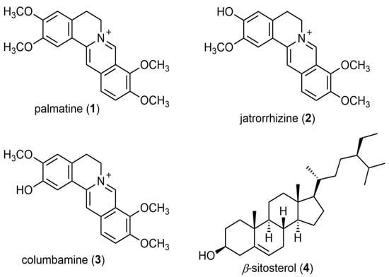 - Nyasse, B.; Nkwengoua, E.; Sondengam, B.; Denier, C.; Willson, M. Modified berberine and protoberberines from Enantia chlorantha as potential inhibitors of Trypanosoma brucei. Die Pharmazie 2002, 57, 358–361. [Google Scholar] [CrossRef]