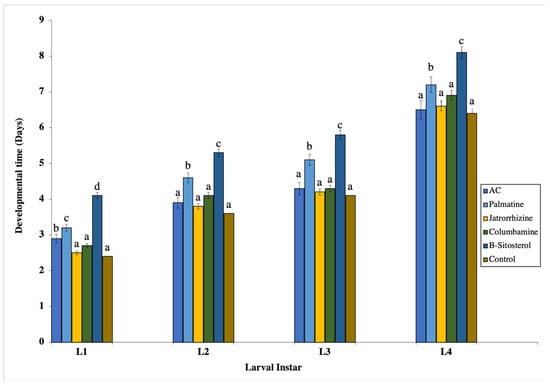 Effect of tested LC50 concentrations of palmatine, jatrorrhizine, columbamine, β-sitosterol, and Annickia chlorantha extract (AC) on the mean developmental durations of Culex pipiens larvae. Bars with different letters are significantly (p < 0.05) different. Data presented as mean ± SE. Three replicates were used in each treatment. Sample size (n) = 75 for the control and L1 groups; n = 45 for the L2 group; n = 41 for the L3 group; and n = 36 for the L4 group. Sample sizes were almost the same for the different tested compounds.