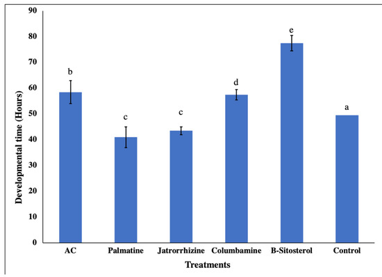 Effect of tested LC50 concentrations of palmatine, jatrorrhizine, columbamine, β-sitosterol, and Annickia chlorantha extract (AC) on the mean pupal developmental durations (hours) of the mosquito, Culex pipiens. Bars with different letters are significantly (p < 0.05) different. Data presented as mean ± SE of three replicates.