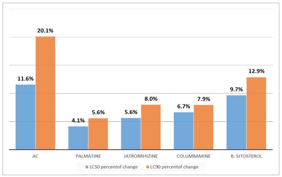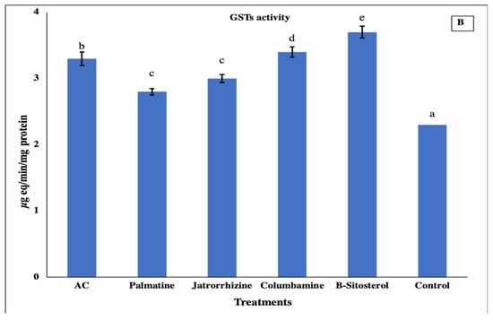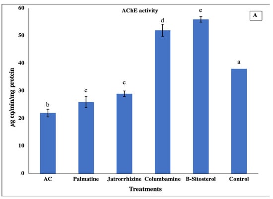 The botanical extracts showed various effects on the growth and development of many insect pests, affecting the larval, pupal, and adult stages, and prolonged/shortened their development [35]; it also reduced the survival rates of larvae and pupae, and affected the adult emergence [36]. Many botanical extracts have been reported to have a pronounced effect on the developmental period, growth, and adult emergence [5,37]. Detoxification enzymes, such as acetylcholinesterase and glutathione S-transferase, are known to be key enzymes in insect pest control strategies. Acetylcholinesterase (AChE) protects insects from chemical poisons, whereas glutathione S-transferase (GST) plays an important role in protection mechanisms against oxidative stress. Herein, AChE showed different activity patterns, where it was significantly increased in columbamine and β-sitosterol treatments, and decreased in (AC), palmatine, and jatrorrhizine treatments, whereas GST was significantly increased in all tested materials. In similar studies, Al-Solami [38] found that Lantana camara extract significantly restricted the AChE activity in larvae, as compared to larvae treated with other plant extracts and/or positive control, and successfully reduced the GST levels.