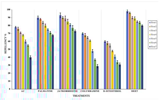 For the repellency assay, the LC50 concentration from each tested material was directly applied on the ventral surface of the pigeon after abdominal feather removal, to allow starved females to blood-feed. The obtained results revealed that all tested materials possess repellence properties, particularly at the beginning of exposure; interestingly, jatrorrhizine and palmatine recorded higher levels of protection, followed by AC, columbamine, and β-sitosterol for 7 consecutive hours compared to the negative control, which recorded zero repellency. By comparing the obtained results with the positive control, the tested materials showed significant differentiation (p < 0.01) for AC, palmatine, jatrorrhizine, columbamine, and β-sitosterol, except exposure to palmatine and jatrorrhizine at the first hour, which showed non-significant variance (p > 0.05) compared with the positive control (DEET), which decreased from 96.0 ± 1.0 h at the first hour to 80.0 ± 1.5 h at the seventh hour (Figure 5). Overall, there was decreased repellent action over time from all tested materials.