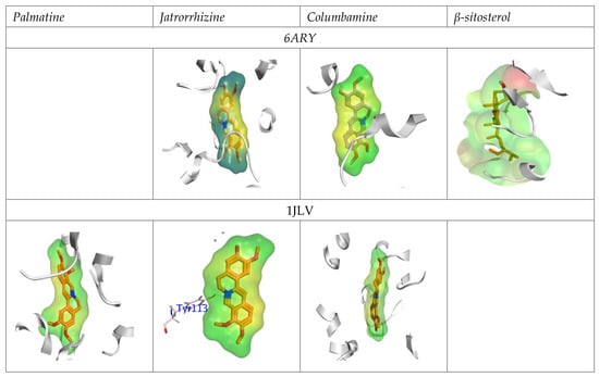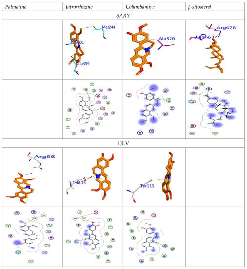 The LIGPLOT tool was used to generate the 2D interaction maps. The 3D chemical interaction between the isolated compounds and 6ARY and 1JLV domains has been visualized and represented in Figure 7.
