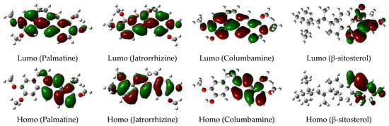 Frontier molecular orbitals are significant in a variety of chemical and pharmacological activities [53]. The Highest Occupied Molecular Orbital (HOMO) has the priority to provide electrons, whereas the Lowest Unoccupied Molecular Orbital (LUMO) accepts electrons first [54,55]. Thus, studying the frontier orbital may assist in the investigation of insecticidal action. Tested compounds with a significant differential in activity were chosen for DFT comparison. Iteratively solving the self-consistent field equation yielded the optimized geometry corresponding to the minimum of the potential energy surface. Table 5 lists the LUMO and HOMO energies, as well as the HOMO–LUMO (HL) gaps (in eV) of isolated compounds. These orbitals were able to display the binding manner of a biomolecule with a receptor. The FMOs gap was characterized by the chemical reactivity and kinetic stability of the molecule. The molecule with a high EHOMO reflects the strong ability of the molecule for donating electrons, as well as it being easier to lose the electron of valence to biological media; hence, enhancing interactions with a receptor and vice versa. The considerable difference in larvicidal activity may be due to the differing electron distributions among the isolated compounds. When the molecules’ HL gaps were compared, the order was β-sitosterol > jatrorrhizine > palmatine > columbamine. The small HOMO–LUMO gap predicts a high chemical reactivity [56]. This showed that the compounds (palmatine and columbamine) would have a reasonably high activity, which corresponded well with our experimental findings. The HOMO and LUMO maps are shown in Figure 9.