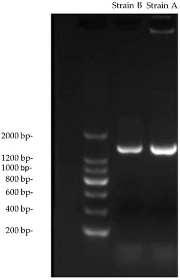 Two strains of bacteria, A and B, were identified in M. orientalis based on morphological observation and 16S rRNA sequencing. Figure 1 shows the results obtained from the 1.5% agarose gel electrophoresis of the PCR products. Clear bands corresponding to a length of 1500 bp were observed.